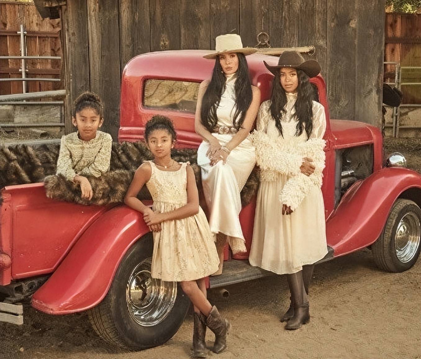 5. 43岁的瓦妮莎携三位千金以飒爽英姿亮相,身着风格鲜明的西部牛仔服饰,母女四人伫立于一辆复古红色老爷车旁,身后是斑驳质朴的木质门框与窗棂,整个画面宛如一幅定格�世纪美国边疆时代的油画,弥漫着自由奔放的气息。